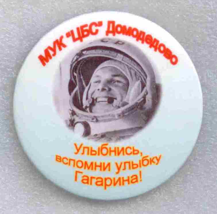 Портрет Гагарина с очень правильным призывом. Диаметр 50 мм.