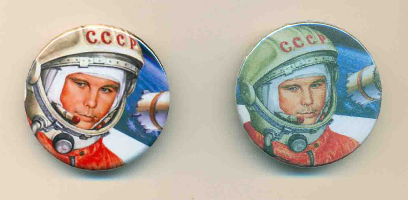 Значок-пуговица.Надпись на скафандре Гагарина -СССР-зеркальная.