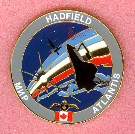 Канадский значок, посвящённый полёту канадского астронавта Криса Хадфилда (Hadfield) на станцию Мир в ноябре 1995г. На станцию Хадфилд был доставлен на борту спэйс-шатла Атлантис.