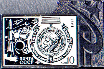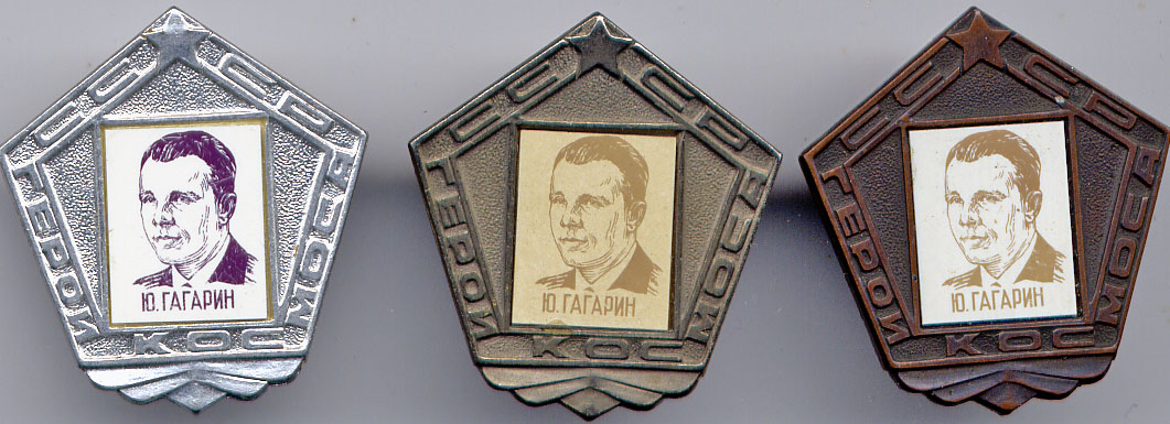 Значок, показанный ниже, - копия медали им. Гагарина - почетной награды ФАИ. А если говорить точнее, то его и копией назвать нельзя, т.к. медаль им. Гагарина золотая.