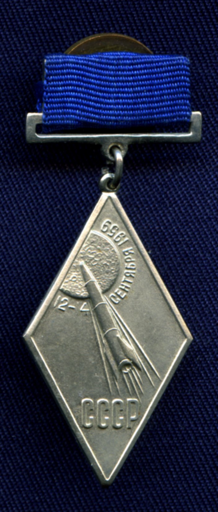 А ниже скан значка, явно приуроченного к Луне-2 (пятиугольник - копия сегмента одного из вымпелов, доставленных Луной-2 на Луну). Его в каталоге Ильинского в сответствующем разделе я не видел.