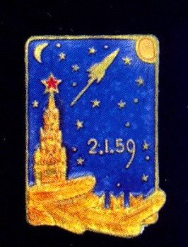 Ниже изображение очень красивого значка по Луне-1. По каталогу Ильинского №Х.9. (вариант без еловых веток Х.10). Никогда не видел этого значка вживую. Изображение взято из буклета московского мемориального музея космонатики. Он был там изображен в ряду других значков. Подпись гласила, что все они из коллекции Саукке (соавтора книги "Космонавтика на значках СССР"). В памяти вертится не совсем твердое и неизвестного происхождения воспоминание о том, что значок позолочен (или даже золотой). Хотя в каталоге написано "томпак". Может отзовется кто, видивший знак (или даже счастливый владелец)?