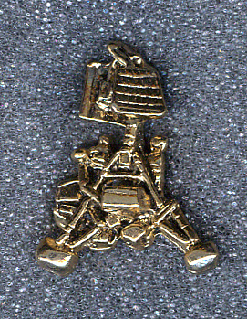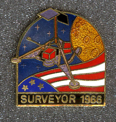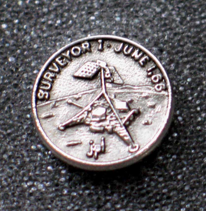 Очень редкий значок (вернее tie tack), выпущенный JPL (Лаборатория реактивного движения). К сожалению плохо получился на скане. Диаметр 12мм. Известен также золотистый вариант. Надпись: Surveyor-1 June 1, 66, JPL.