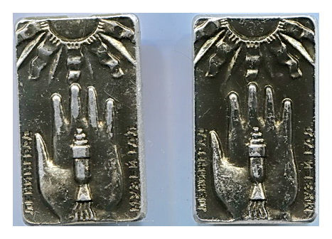 Москва. Выставка "Электроника" в честь 50-летия СССР. Материал латунь. Размер подвески 30х30 мм, планка 30х4 мм.