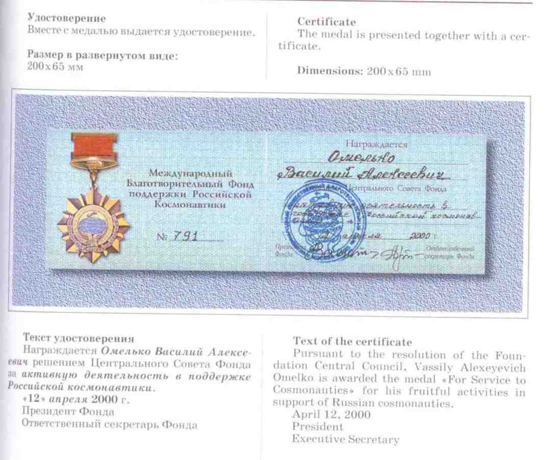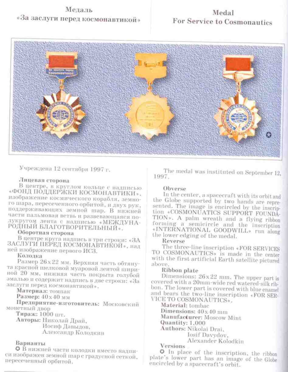 Идея создания знака принадлежит ветерану космонавтики, Первому вице-президенту космонавтики России В.В. Савинскому. По решению Федерации космонавтики России, эта награда вручается гражданам России, посвятившим свою жизнь становлению и развитию науки и техники в области космонавтики, работающим в этой области не менее 25 лет (а также отработавшим в этой области не менее 25 лет) и внесшим значительный личный творческий вклад в дело изучения и освоения человеком околоземного и межпланетного пространств, планет Солнечной системы и другий систем Вселенной.