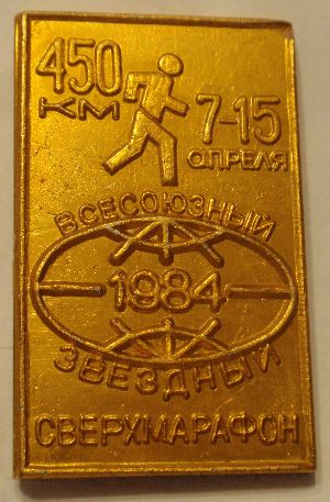 Всесоюзный Звёздный сверхмарафон 1984 год. Приуроченный ко дню космонавтики он проходил с 7 по 15 апреля по маршруту Звёздный городок - Москва - Рязань - село Ижевское Калужской области ( родина К.Э.Циолковского ). Алюминий , размер 22 х 37 мм.
