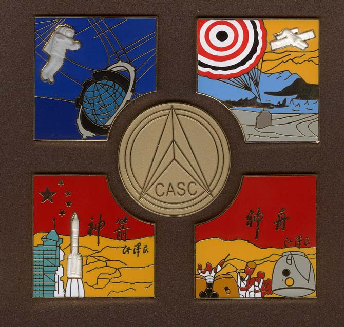 Серия из пяти значков, отображающих этапы полёта Шенжоу-5, выпущенная CASC.