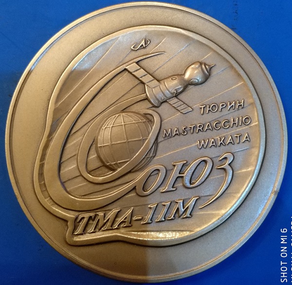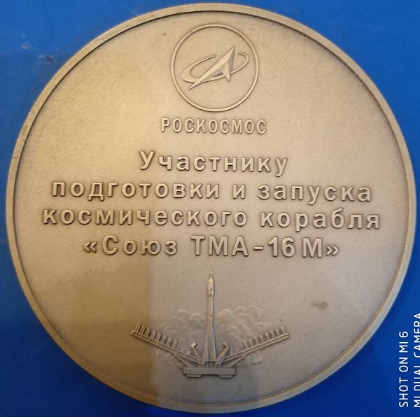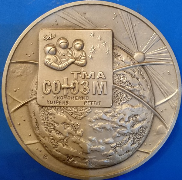 А вот медаль по кораблю "Союз МС-05" по заказу ЦЭНКИ (50-55 штук)была изготовлена уже в Китае.Высокорельефность заменена на "вгрызание" вглубь материала.Материал уже не бронза.Убогой медаль не назовёшь,но она очень отличается от предыдущих и изображение корабля очень пострадало. Забыли дать штырь на стыковочном узле,поэтому к станции приблежается корабль с "блином" впереди.