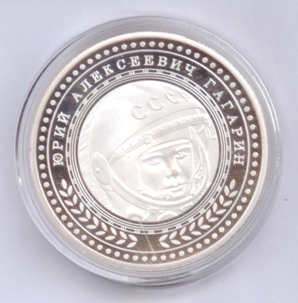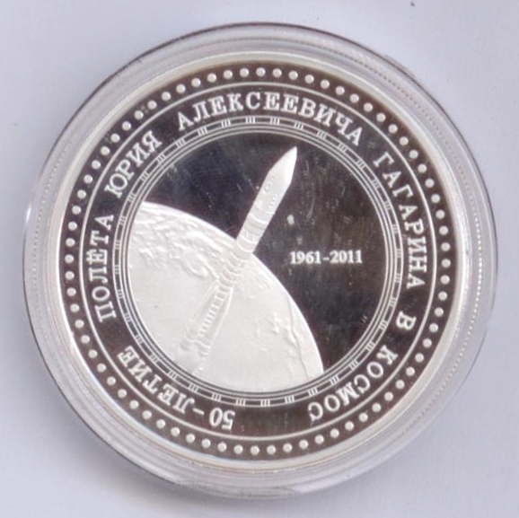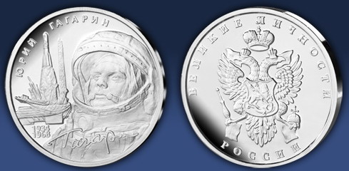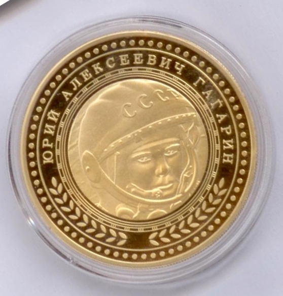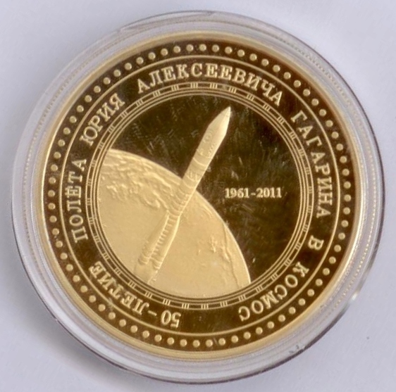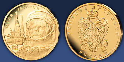 К 50-летию полета Ю.А.Гагарина (желтый и белый металл), выпущена в г. Саратов.