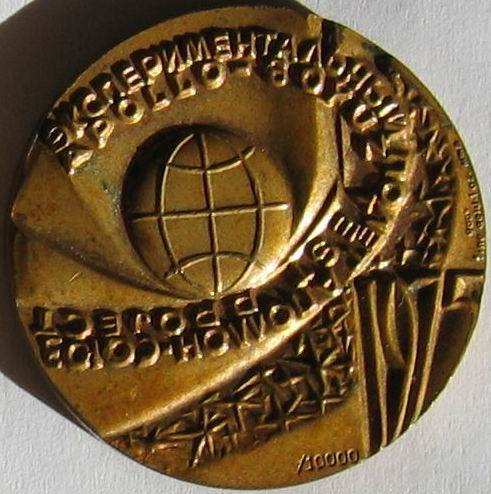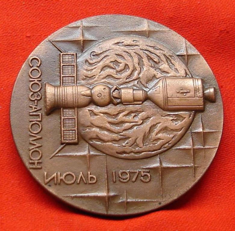 Хорошая, профессионально сделанная медаль (хоть и не монетный двор). Существуют варианты в алюминии с покрытием под медь и в тяжелом металле (бронза?).BoB_Dimon писал(а) :Союз -Аполлон , алюминиевая медаль, диаметр 60 мм.