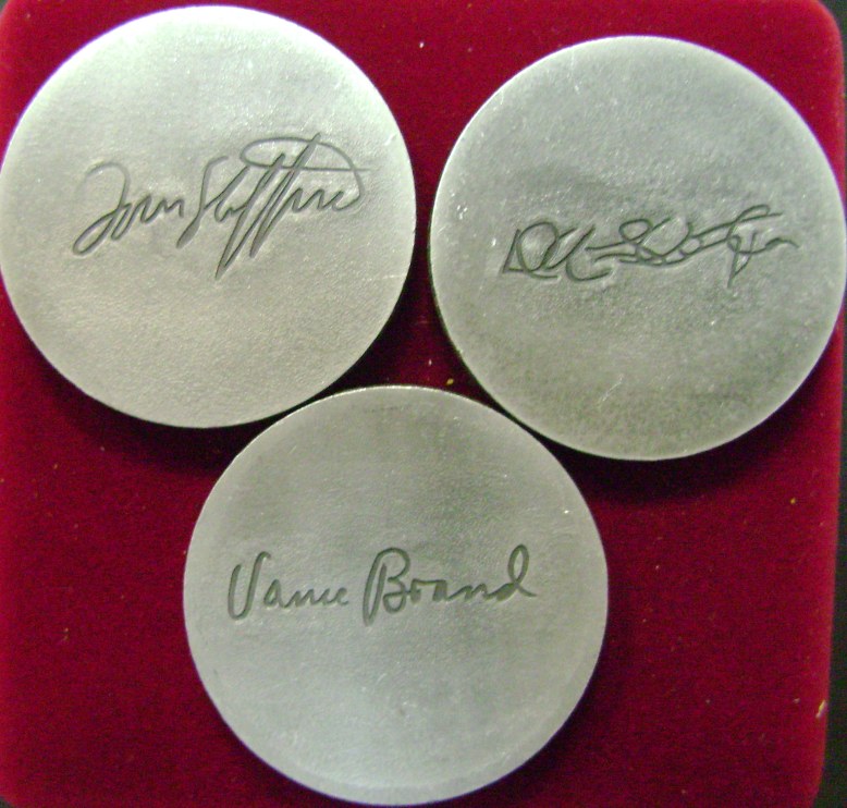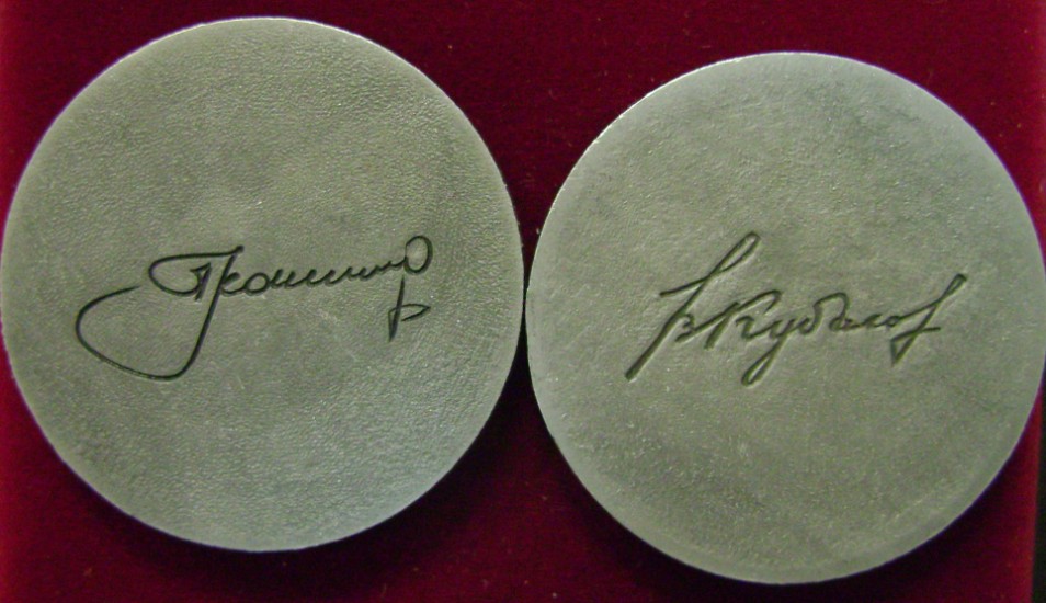 Уважаемый Буджум! Спасибо, что поставили эту медаль и показали клеймо. Теперь будем знать, что она была сделана в СПБ. У меня есть подобная в несколько ином цветовом исполнении и без фамилий космонавтов по внешнему ободу, а также без клейма.Буджум писал(а) :Первый групповой полёт в космос.