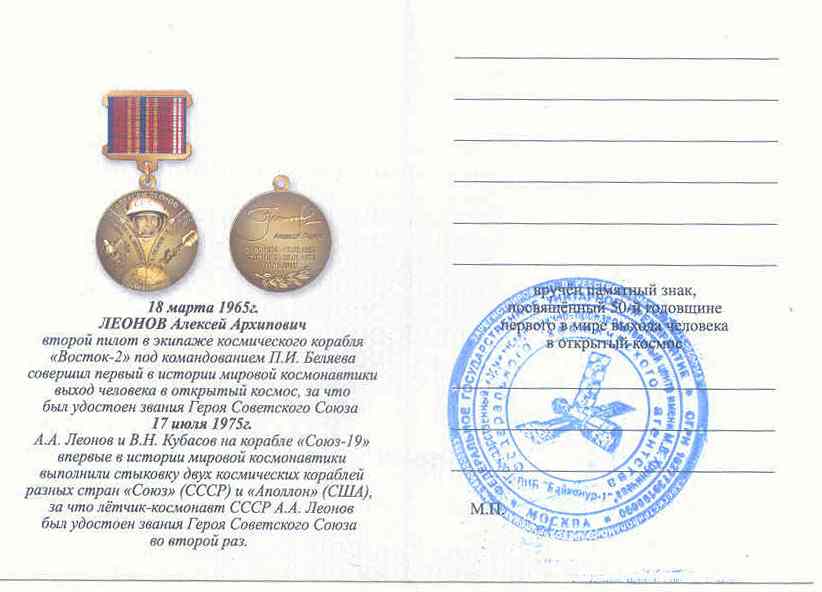 А вот, судя по удостоверению к этой медали, Леонов выходил в открытый космос с "Востока-2", а не с "Восхода-2".