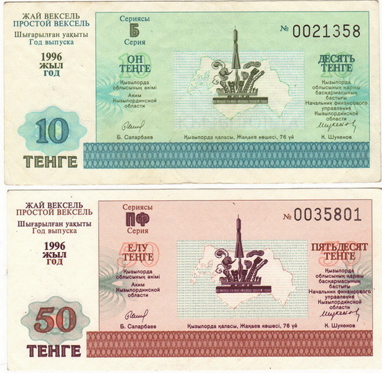 Покажу пару интересных векселей (хотя понимаю, что это бонистика, но думаю, что в тему). Были выпущены в Кзыл-Орде в 1996году при введении тенге, была недостаточно наличности и использовались векселя двух серий (Б- банковсие и ПФ- профсоюзные), 4 номинала- 10, 25, 50 и 100тенге. Отличаются цветом, оформление одинаково. Использовались для оплаты коммуналки, связи, предметов первой необходимости и т.д. Имели хождение около двух месяцев.