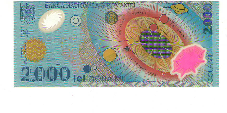 А Румыния в 2000 году выпустила пластиковую банкноту 2000 лей, посвященная полному солнечному затмению (от 11 августа 1999 г.)