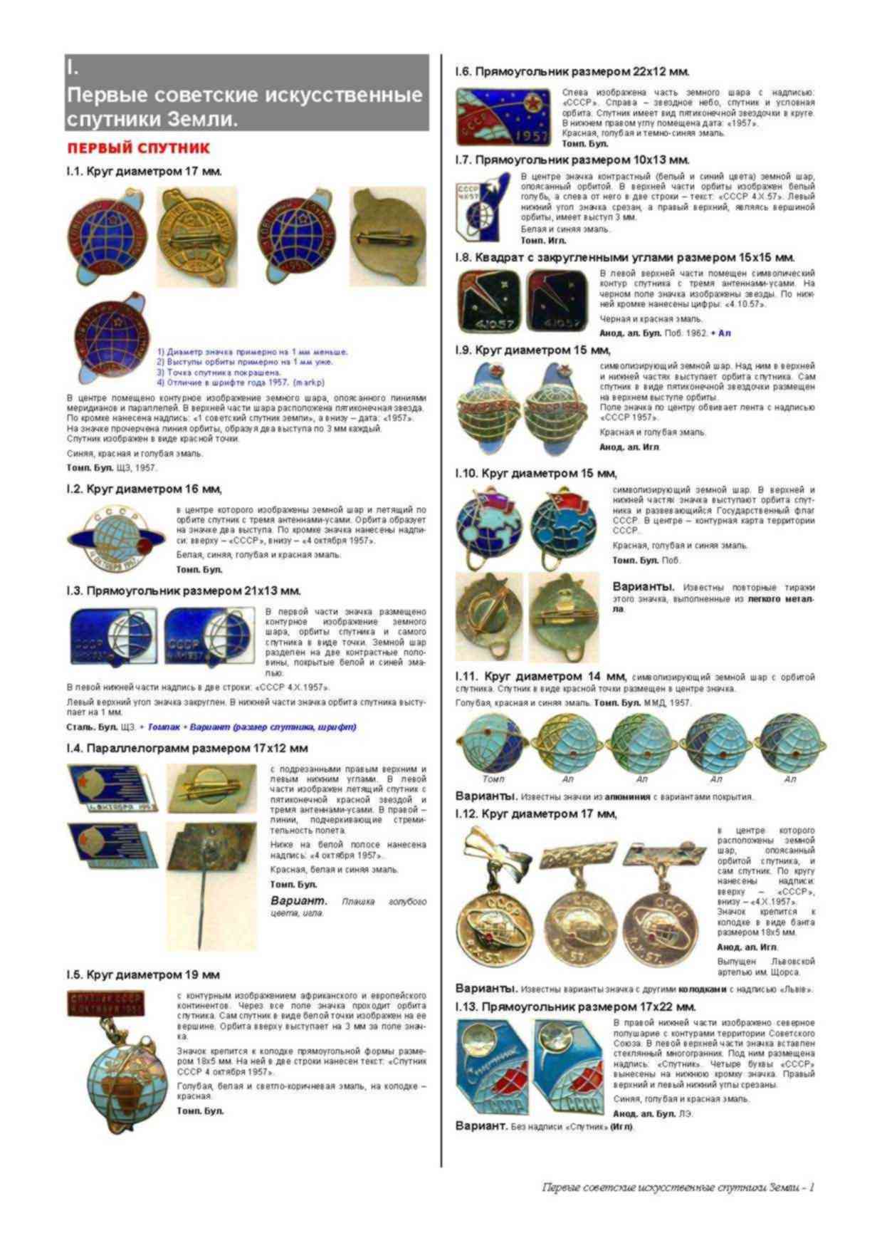 1. Описание значка № I.27 в Каталоге весьма схематичное. Реальный значок http://forum.faleristika.info/download/ ... &mode=view достаточно близко под него подходит за исключением того, чта на нём нет упомянутых "орбит" (цитирую каталог: "В центре его рельефно изображён Земной шар с тремя спутниками и их орбитами"). Орбит как таковых нет; есть "следы запуска" или "шлейфы", которые могли быть изображены, чтобы обозначить движение спутников. Тут есть 2 варианта: либо описание в Каталоге не точное, либо мой значок не I.27