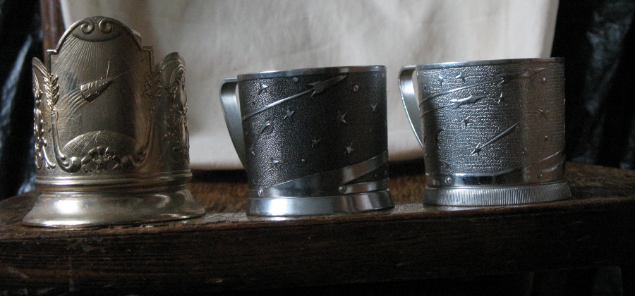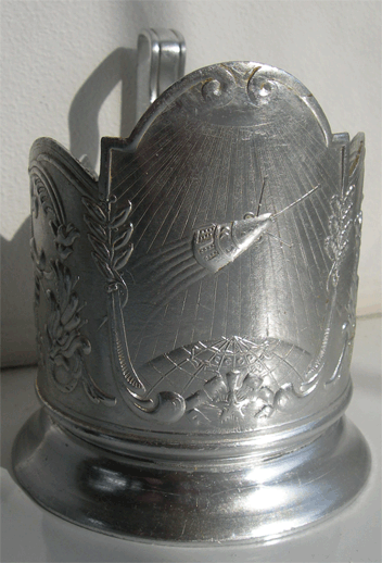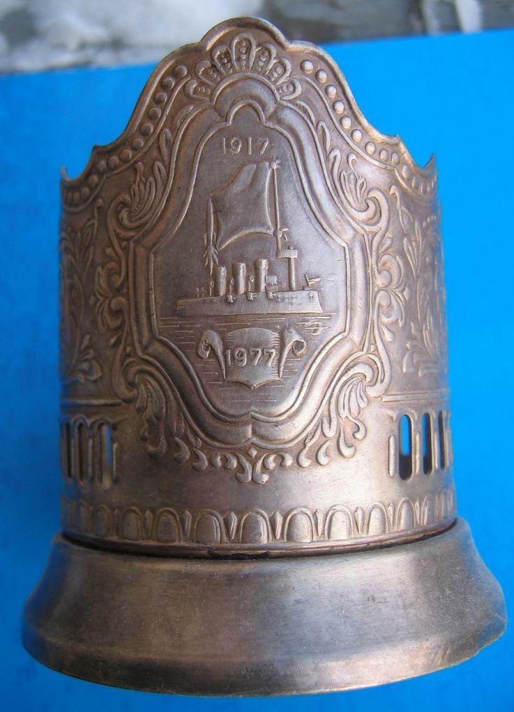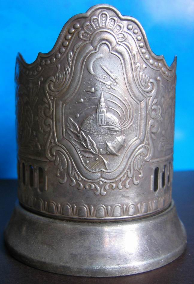 Редкий советский подстаканник, выпускавшийся в 70-е года 20 века. Клеймо: глухарь и "МНЦ". Цена на момент изготовления - 2 рубля 59 копеек. Очень информативный подстаканник - своего рода отчет к 100-летию вождя мирового пролетариата. От одинокого домика с одиноким деревом в Симбирске, из трубы которого идет дымок, через "Аврору" - и до ледокола "Ленин", с вершинами космоса впридачу. Все вехи отражены на фасаде этого изделия.