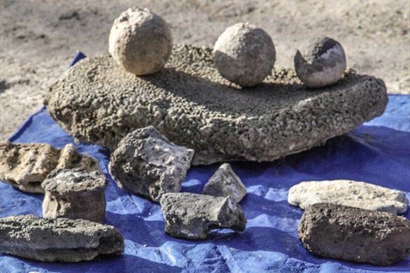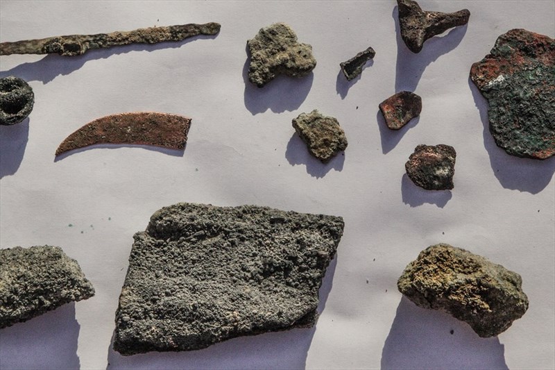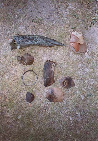 Как и при любых археологических раскопках, обнаружено множество элементов керамики. На фото - обломки керамики сако-усуньского периода (в основном ручки кувшинов), изготовленной 2-2,3 тысячи лет назад. В верхней части фото - рудотерка с тремя камнями для растирания руды. ( нижняя фотография )