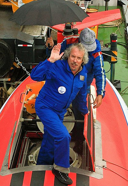 Такого торжественного мероприятия, ну просто никак не мог пропустить и популярный рок-музыкант Андрей Макаревич. И несмотря на то, что ГОА "МИР" - это совсем не "Машина времени", всё-таки ему удалось прогуляться по дну Байкала и составил ему компанию представитель фонда содействия сохранения озера по Иркутской области М.Щадов, ну и разумеется, пилот аппарата "МИР-2" Е.Черняев. В поисках артефактов троица опустилась на 500-м глубину, но не повезло и на сей раз, "презренного металла" обнаружить на дне не удалось. :D