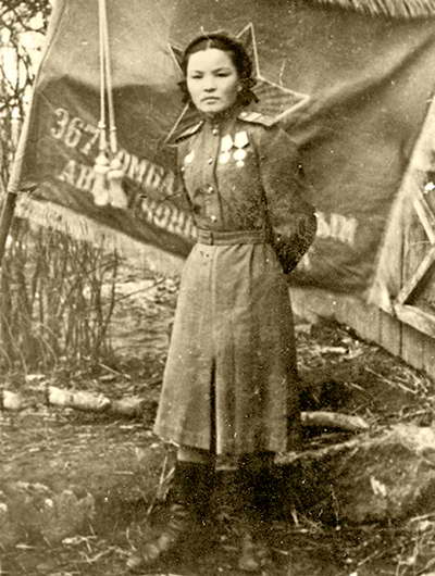 Дамеля Жакеева, стрелок 317-го Краснознаменного штурмового авиаполка, за отличную фронтовую службу сфотографирована у Знамени полка. 1943 год