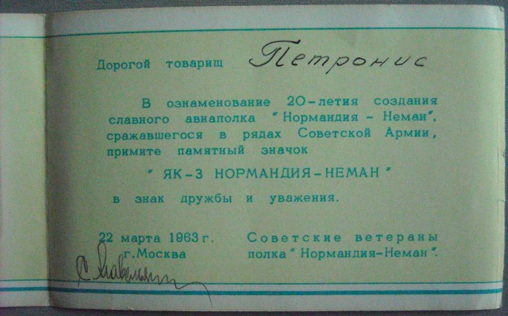 «Легендарный командир эскадрильи «Нормандия» майор Жан Луи Тюлян (в середине), командир 1 АЭ ст.лейтенант Альберт Прециози (слева), мл.лейтенант Марсель Альберт (справа) весной 1943 года на аэродроме г. Козельска.»