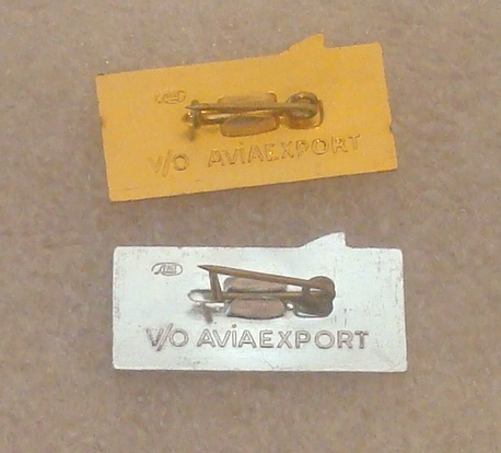 У меня два вида этого знака изготовленного из алюминия, холодная эмаль, булавка, 29 мм х 13 мм, производства ЛМД для ВО "Авиаэкспорт".