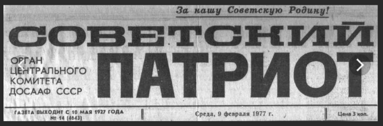 СПАСИБО!!!! Разобрался это газета Военно-воздушных сил ГСВГ-ЗГВ. Помогло то что, газета ДОСААФ выходит дважды в неделю, а газета ГСВГ - ежедневная. И в ДОСААФовской газете указывается издатель.GSFG писал(а) Пт, 18 авг 2023 22:29:43: ↑В этой статье фрагмент другой газеты, не ДОСААФ.Стас КСЛ писал(а) Пт, 18 авг 2023 22:12:00: ↑Посмотрите: https://ru.wikipedia.org/wiki/Советский ... т_(газета)