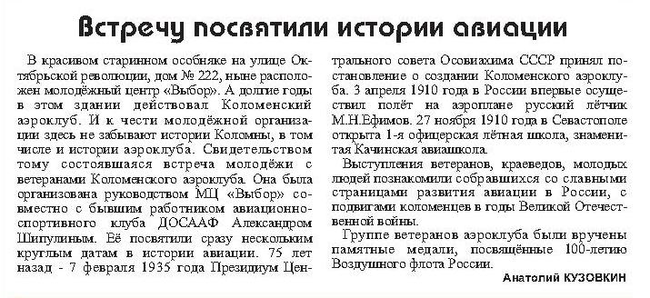 Эта информация из заметки, опубликованной в газете "Коломенская правда". Автор заметки - крупнейший коломенский краевед Анатолий Кузовкин. Не доверять ему, вроде как, оснований нет.DMIK писал(а) :Коломенский аэроклуб создан в феврале 1935 г. постановлением Президиума Центрального совета Осоавиахима СССР.