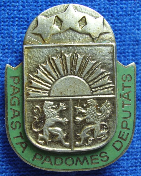 Знаки депутатов городских дум - серебро, клипса. 1ряд: Лиелварде,Апе,Броцени,Баложи,Стайцеле,Талси,Салдус. 2ряд: Алуксне,Икшкиле,Огре,Гулбене,Саласпилс,Аизкраукле,Бауска. 3ряд: Карсавская волость,Цесвайне,Вангажи,Талсинская волость,Гулбене,Алуксненская волость.