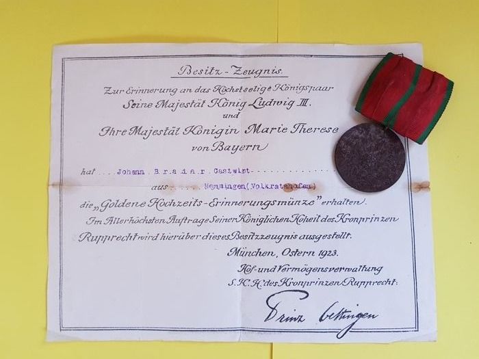 Кронпринц вручает медали тем, кому хотел вручить их его отец, а то есть бывшим военнослужащим подшефных полков. Но также медали вручались, как встречается в литературе, вплоть до 1935 года, персонам, за заслуги по воссозданию и поощрению патриотических монархических идей баварского государства. В дальнейшем было разрешено снабдить медаль ушком и кольцом и носить на ленте юбилейной медали (красной с зеленым краем). Когда это было принято, каких то данных я не нашел.