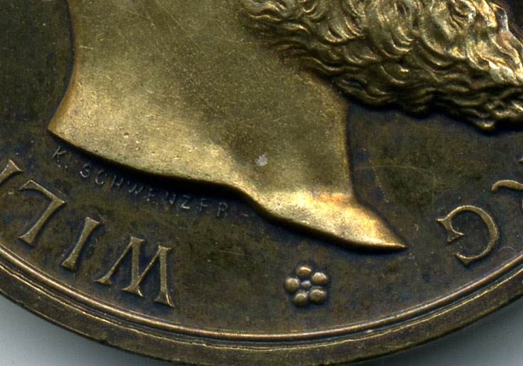 Аверс ; портрет Вильгельма II смотрящего направо , надпись по кругу «WILHELM II KOENIG VON WUERTTEMBERG» .клеймо «K.SCHWENZER»