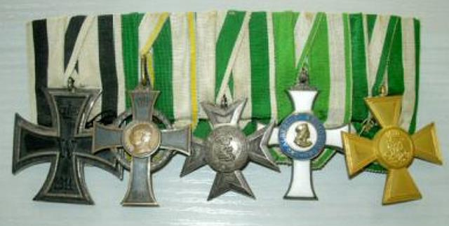 На обратной стороне креста находится надпись WELT- KRIEG (мировая война) и в центре медальона вензель короля - учредителя F A с короной.