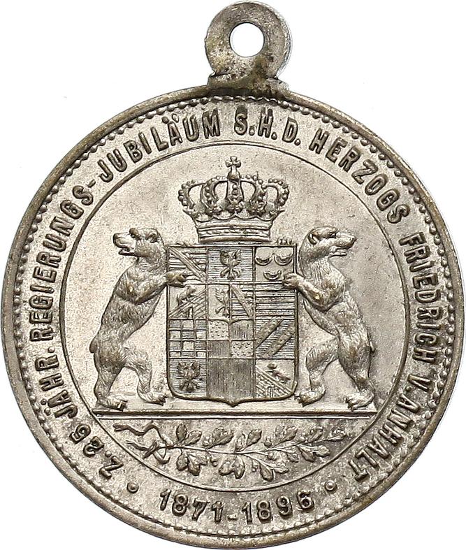 Реверс ;в центре большой герб герцогства Ангальт-Дессау ,по кругу медали надпись «Z.25 JAHR. REGIRUNGS-JUBILAUM S.H.D. HERZOGS FRIEDRICH V.ANHALT» (25 лет правления герцога Фридрих Анхальт) и дата «1871-1896)