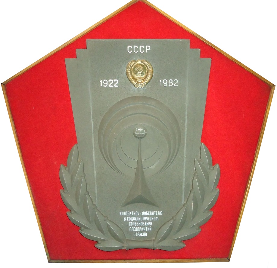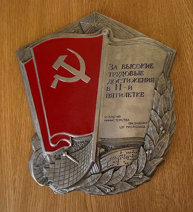 Встретился на моем жизненном пути вот такой предмет, своеобразная увеличенная копия редкого нагрудного советского знака. Думаю коллективная награда. Плакетка находилась в бывшем музее бывшего орденов Ленина и Трудового Красного Знамени Рыбинского завода полиграфических машин и я успел её перехватить перед тем, как оставшиеся после разгрома музея экспонаты отправились на свалку.