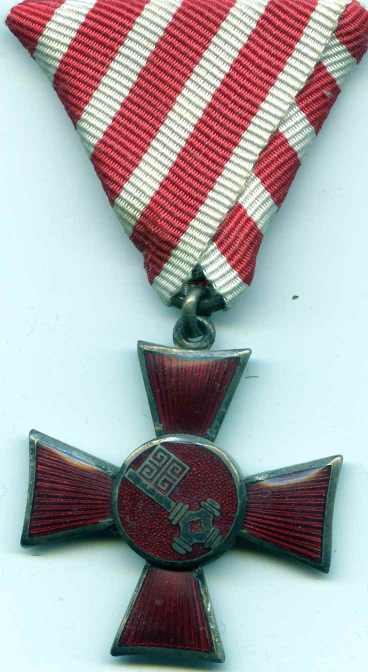 Крест посеребренный; Аверс- красная эмаль , центральный медальон размещен герб Гамбурга