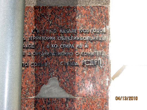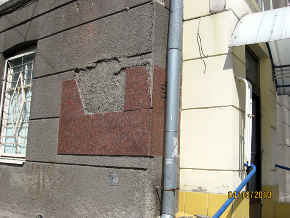 К сожалению, не знаю, как выглядела эта мемориальная доска в «застойные времена». На фото видно, что какой-то фрагмент со стены сорван. Водосточная труба бесцеремонно пересекла доску с надписью. По оставшимся буквам можно восстановить текст: