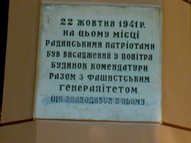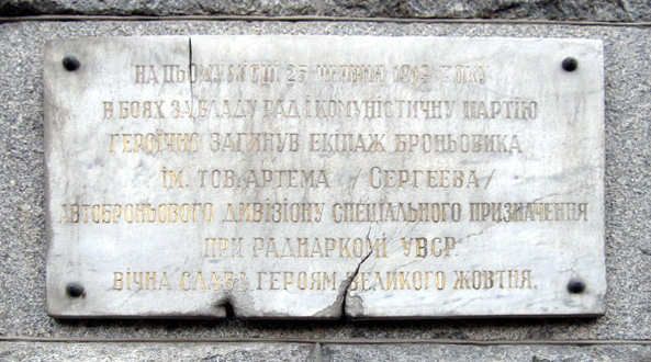 5 ноября 1957 года, накануне 40-летия Великого Октября на площади Советской Украины, на фасаде здания исполкома Совета народных депутатов была установлена мемориальная доска, которая напоминает всем, что на этом месте деникинцами был расстрелян экипаж броневика им. Артема автобронедивизиона особого назначения при Совете Народных Комиссаров Украины под командованием Ю. Станкевича.