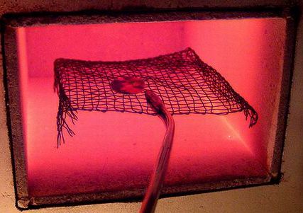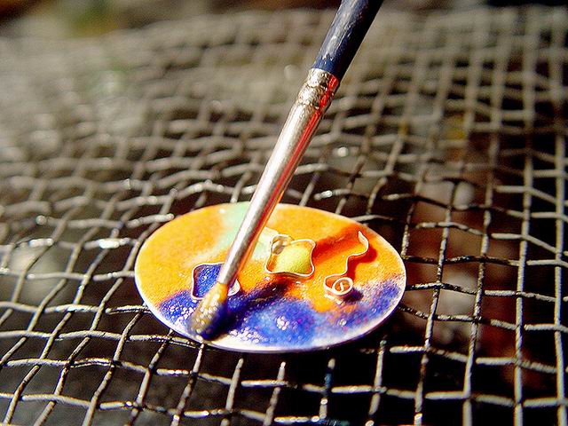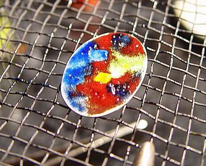 В специальных печах(МУФЕЛЬНЫЕ печи) или с помощью газовой горелки изделие нагревается до температуры плавления песка (примерно 900 градусов). Окрашенный песок спекается в стекловидную массу. Обжиг повторяется, как минимум, столько раз, сколько цветов эмалей присутствует в изделии.