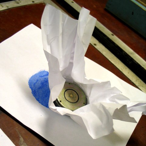 Следующий этап: омагничивание. Во время дробления и размалывания в эмалевый порошок попадают частицы металла от ступки. Их следует удалить. Можно использовать магнит от динамика, завернутый в бумагу.