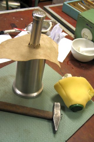 Это стальная ступка. Кусок кожи предотвращает вылетание осколков стекла. Респиратор защищает от стеклянной пыли. Молотком бьют по пестику. Можно и без молотка, тк пестик тяжелый, но будет немного дольше.