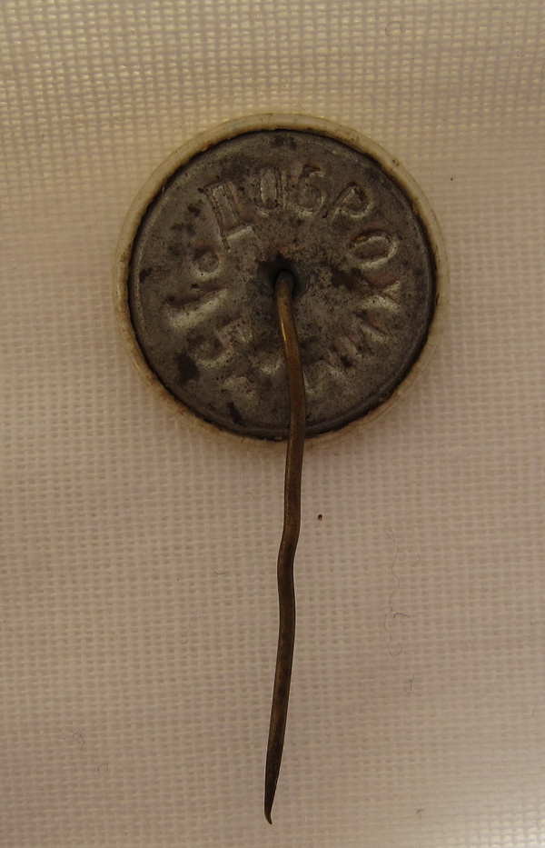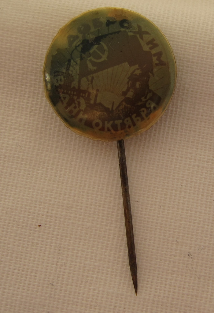 Агитационные значки Доброхима. 1924 г. Латунь, фото, целлофан, иголка.
