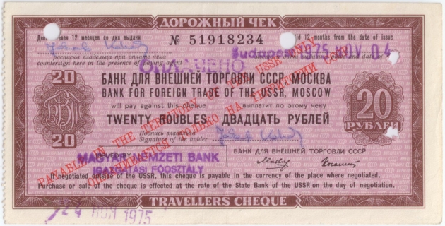 Дорожный чек Банка для внешней торговли СССР номиналом 20 рублей выпуска (1970) года с "косым текстом". Выдан в ноябре 1975 года. Погашен. Два вертикальных сгиба по центру, подмята правая кромка, сбиты правые уголки.