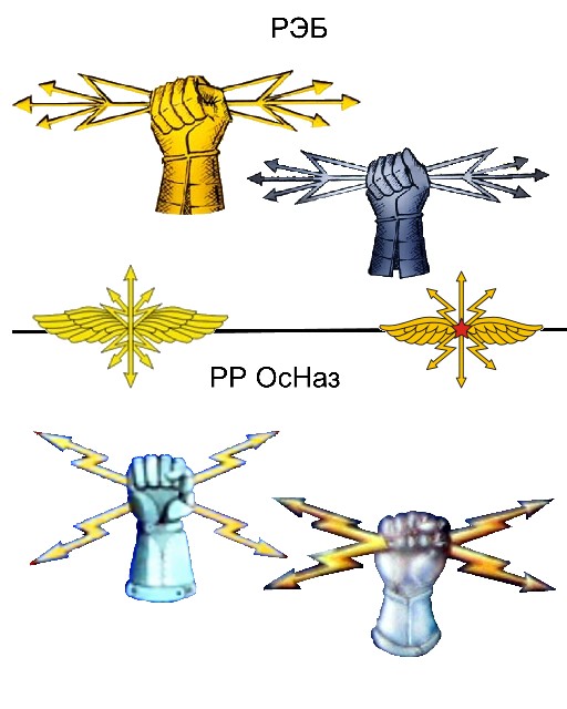 В официальных источниках данный символ (без гвоздики) относят к радиозлектронной борьбе (РЭБ), а это не только радиоразведка, но и радиоподавлениеinvestclub писал(а) : то эмблема РАДИОРАЗВЕДКИ, которую все сегодня величают =ОсНаз=.Крага (перчатка с раструбом), сжимающая косой крест из молний, символизирующая радиоперехват, была эмблемой радиоразведки еще в советское время. Короче, там, где есть крага с молниями - это осназ.