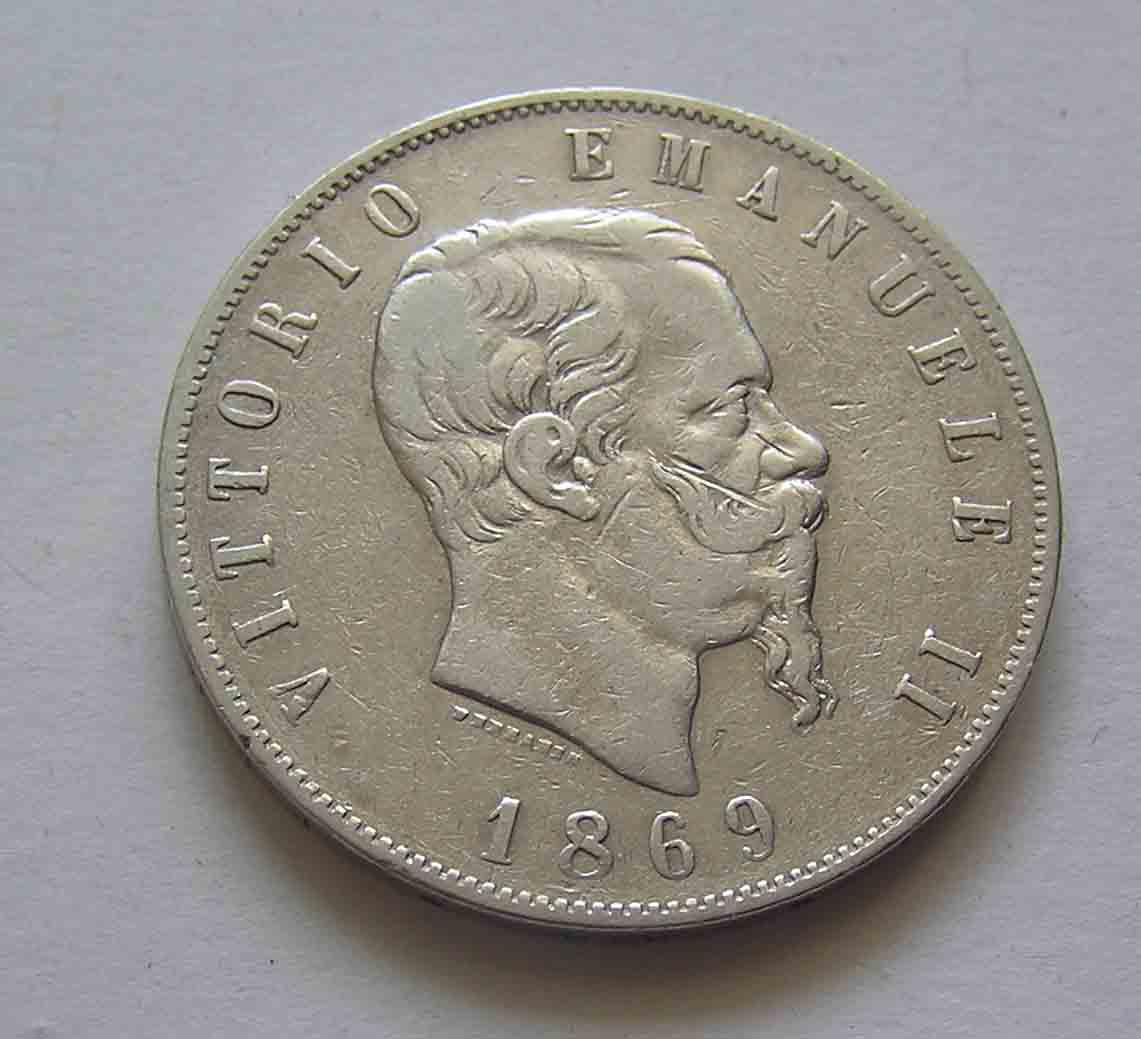 Италия. 5 лир 1869 года.