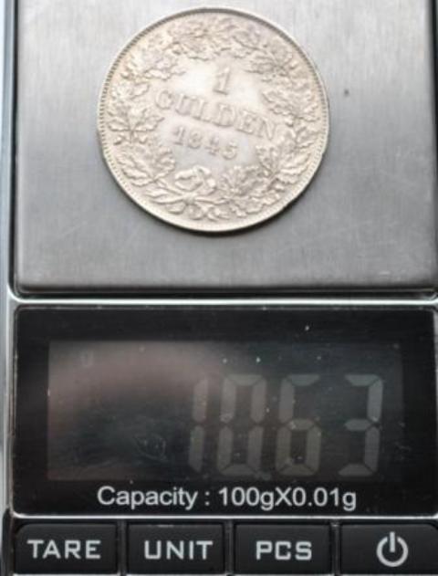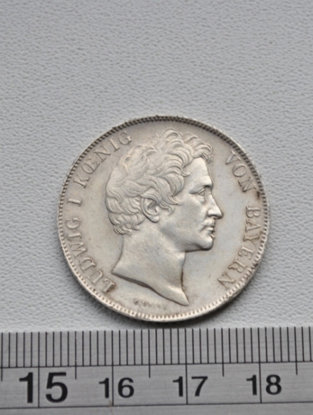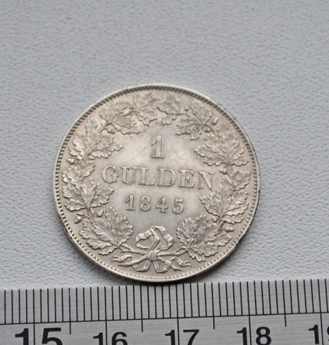 На аверсе расположен портрет короля Баварии – Людвига I (1786-1868), по кругу расположена легенда: «LUDWIG I KOENIG VON BAYERN». На реверсе в центре дубового венка в три строки указан номинал валюты и дата чеканки «1 GULDEN 1845». Гурт с геометрическим орнаментом, положение аверса к реверсу: медальное.
