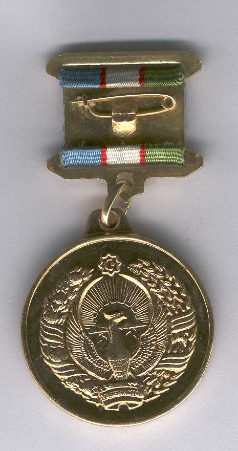 Памятный знак при помощи ушка и кольца соединяется с прямоугольной колодкой, покрытой шелковой лентой шириной 20 миллиметров цветов Государственного флага Республики Узбекистан.