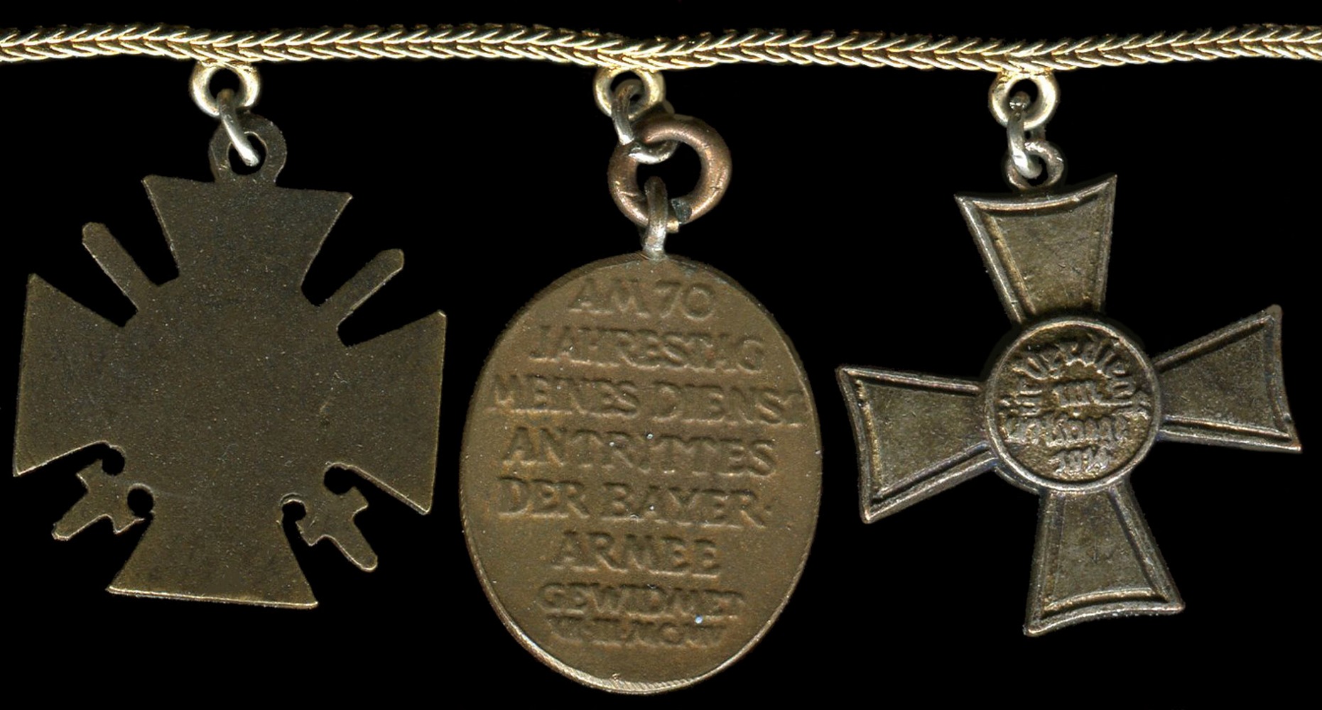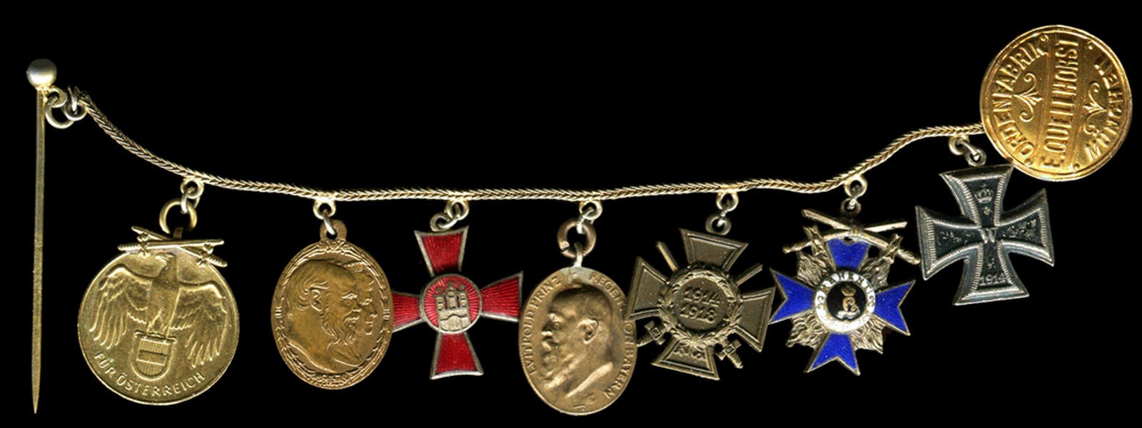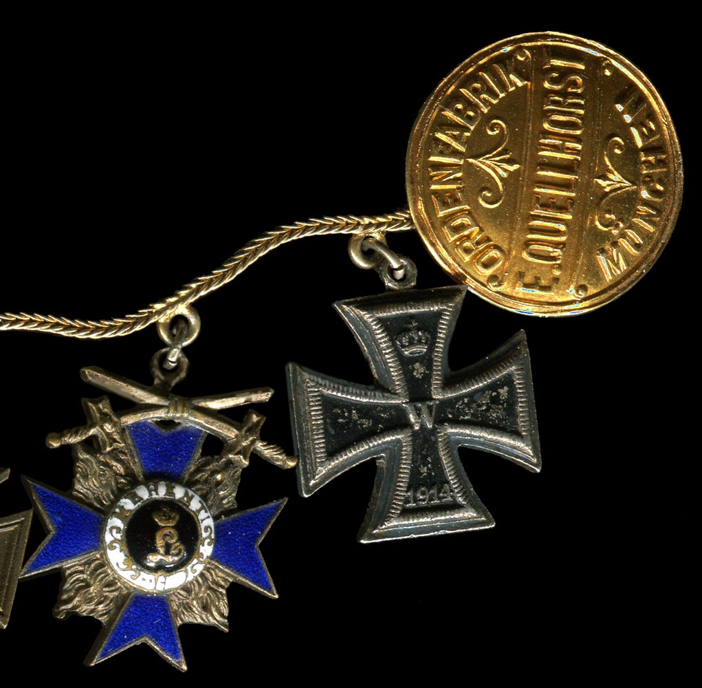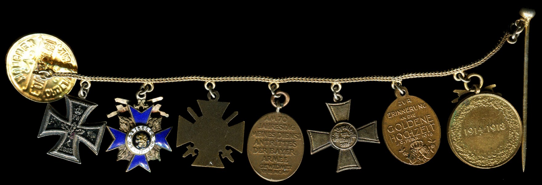 Цепочка из серебра, с 8-ю наградами ветерана ПМВ, награжденного: Железным крестом 2 класса, образца 1914 года; Редким баварским крестом военных заслуг 4 класса, с мечами; Почётным крестом фронтовика, с мечами (Крест Гинденбурга) ,Баварской военной медалью Луитпольда; Ганзейским почетным памятным крестом города Гамбурга для участников 1 Мировой войны; Юбилейной медалью в честь Золотой свадьбы Людвига III и Марии Терезии; Австрийской ветеранской памятной медалью "Участнику 1 Мировой войны 1914-1918 гг.".