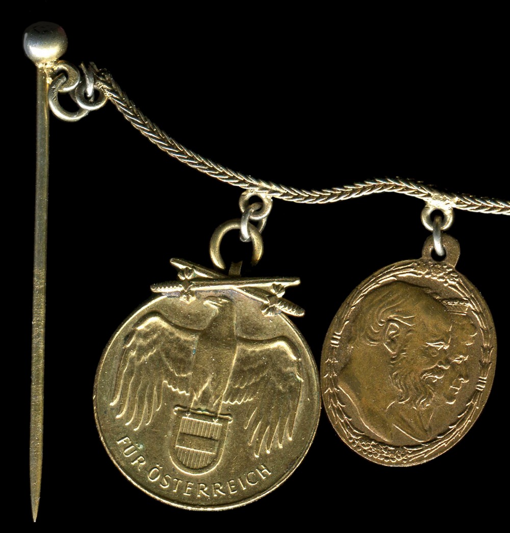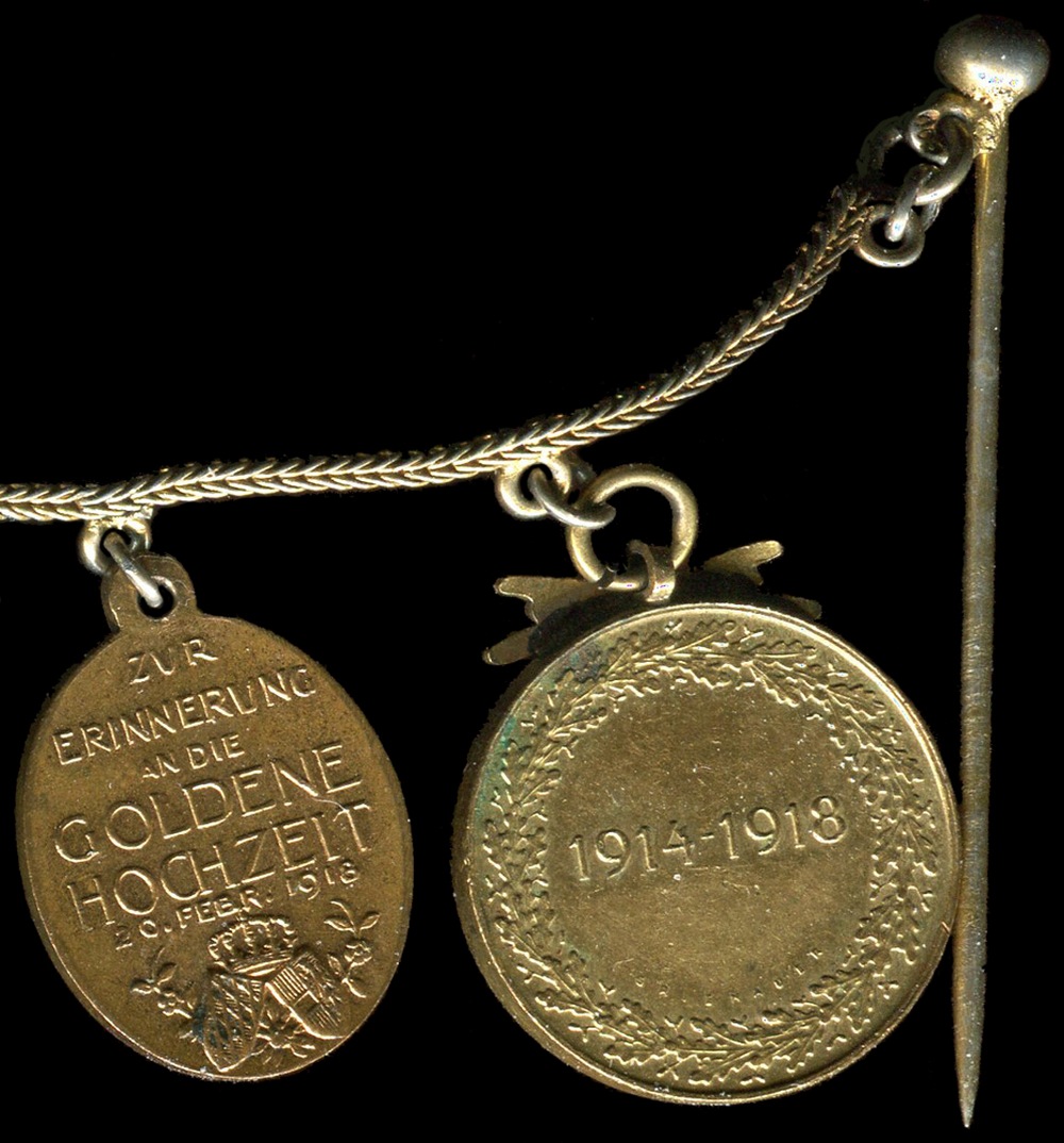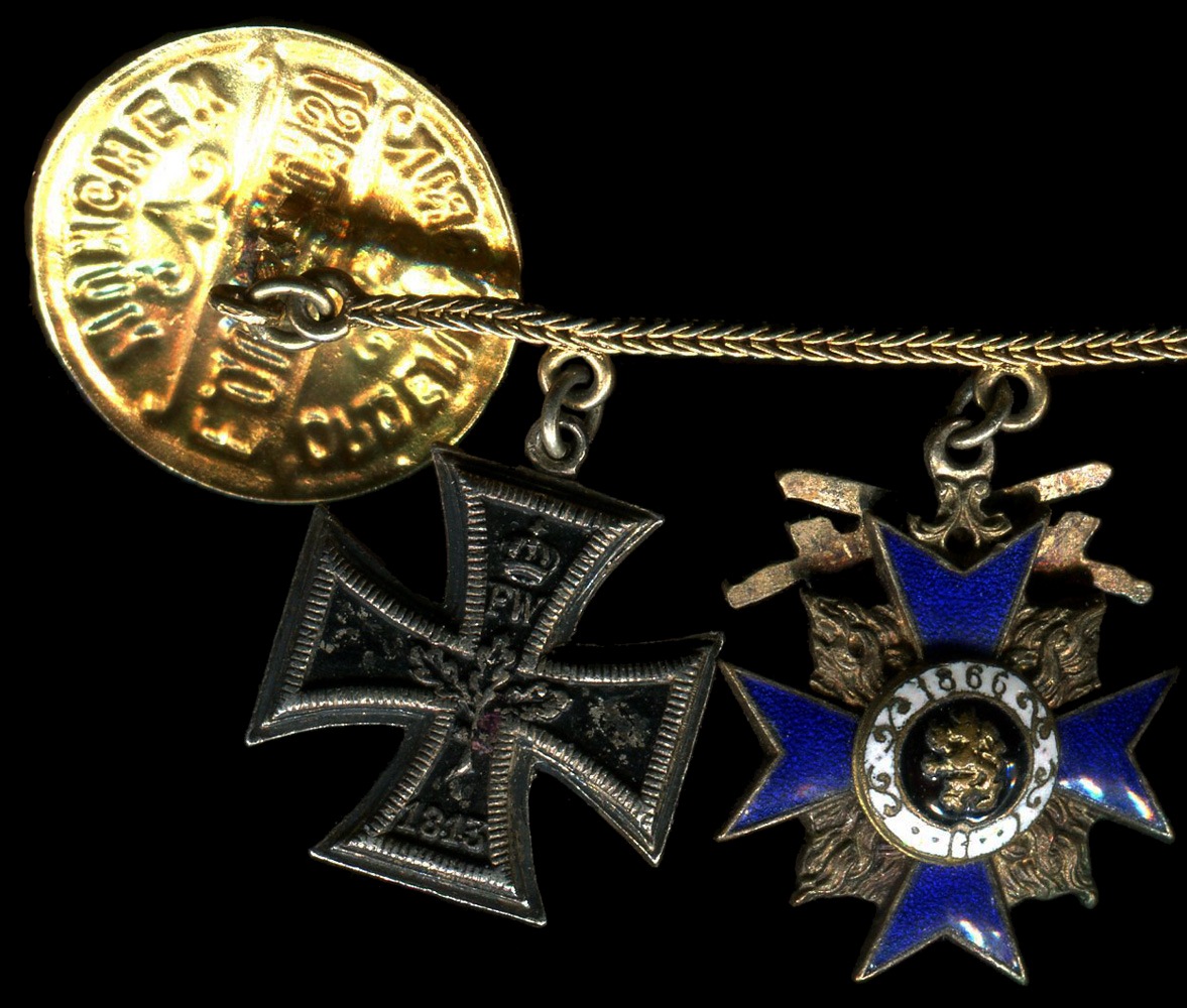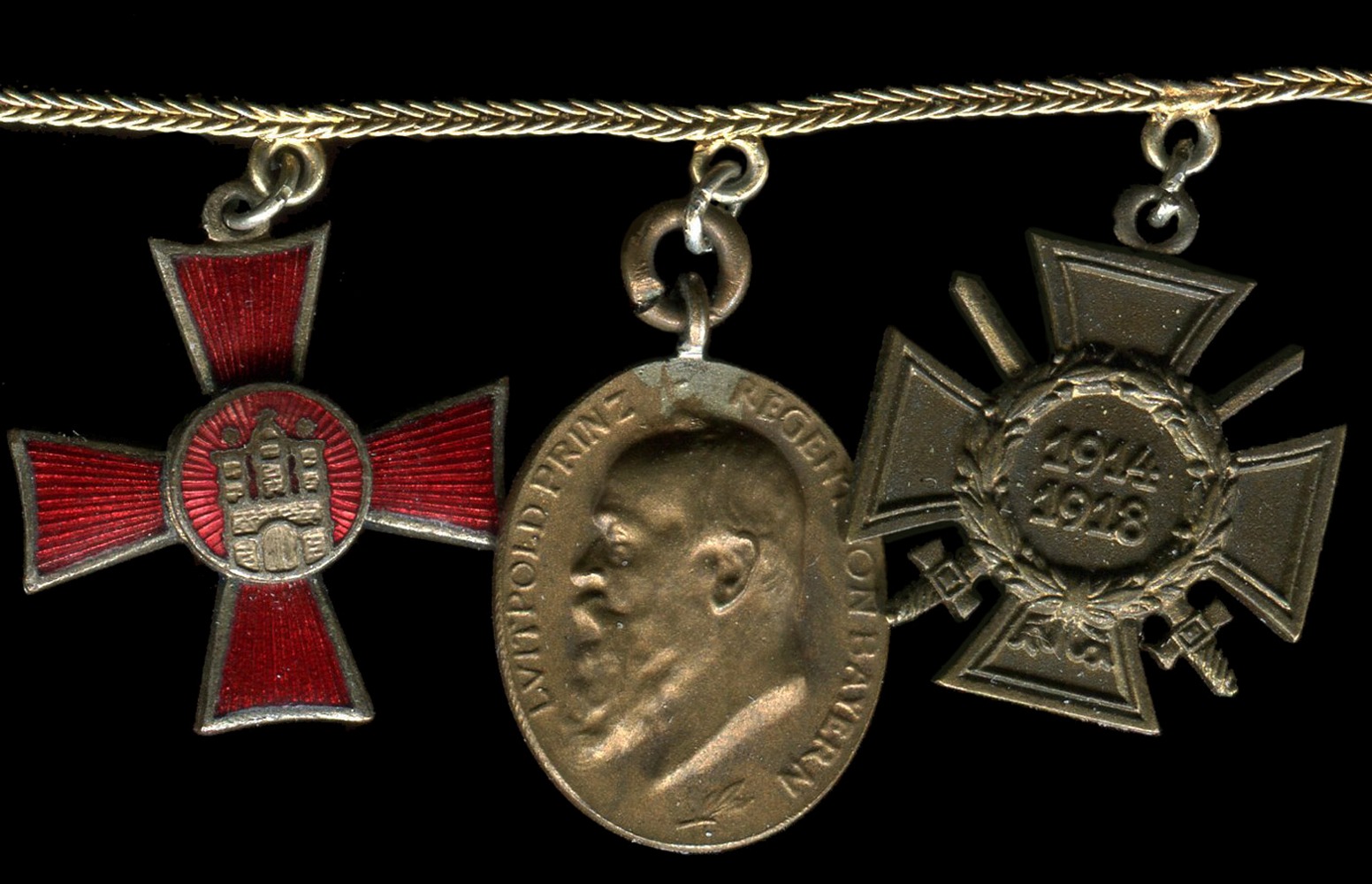 Цепочка из серебра, с 8-ю наградами ветерана ПМВ, награжденного: Железным крестом 2 класса, образца 1914 года; Редким баварским крестом военных заслуг 4 класса, с мечами; Почётным крестом фронтовика, с мечами (Крест Гинденбурга) ,Баварской военной медалью Луитпольда; Ганзейским почетным памятным крестом города Гамбурга для участников 1 Мировой войны; Юбилейной медалью в честь Золотой свадьбы Людвига III и Марии Терезии; Австрийской ветеранской памятной медалью "Участнику 1 Мировой войны 1914-1918 гг.".