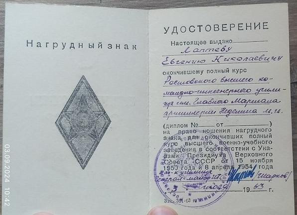 Наименование: Удостоверение к ромбу Ростовское ВУ им.Неделина