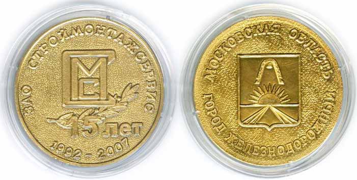 Памятная НАСТОЛЬНАЯ медаль "ЗАО СТРОЙМОНТАЖСЕРВИС – 15 ЛЕТ" (с гербом города Железнодорожный 2002 г.)