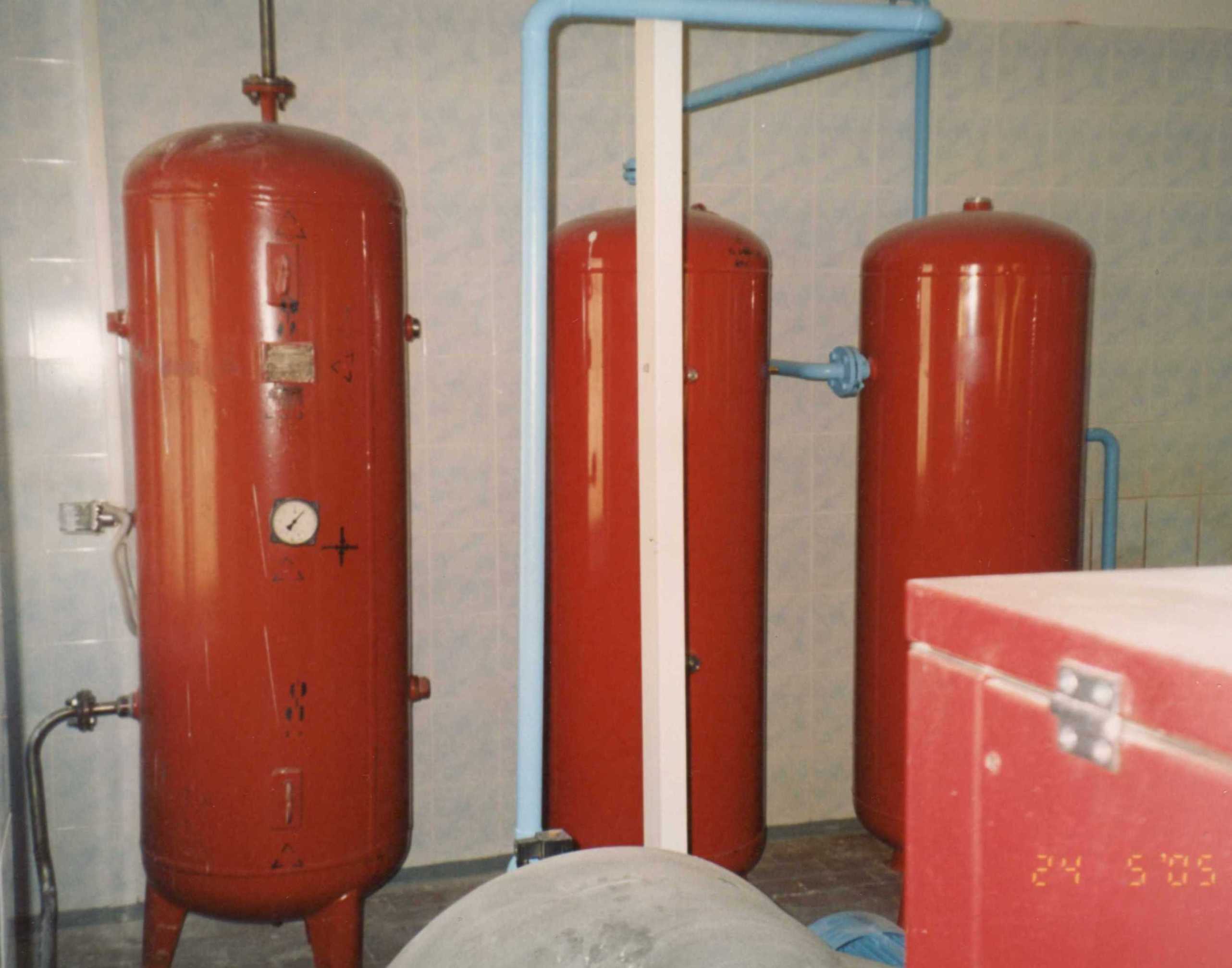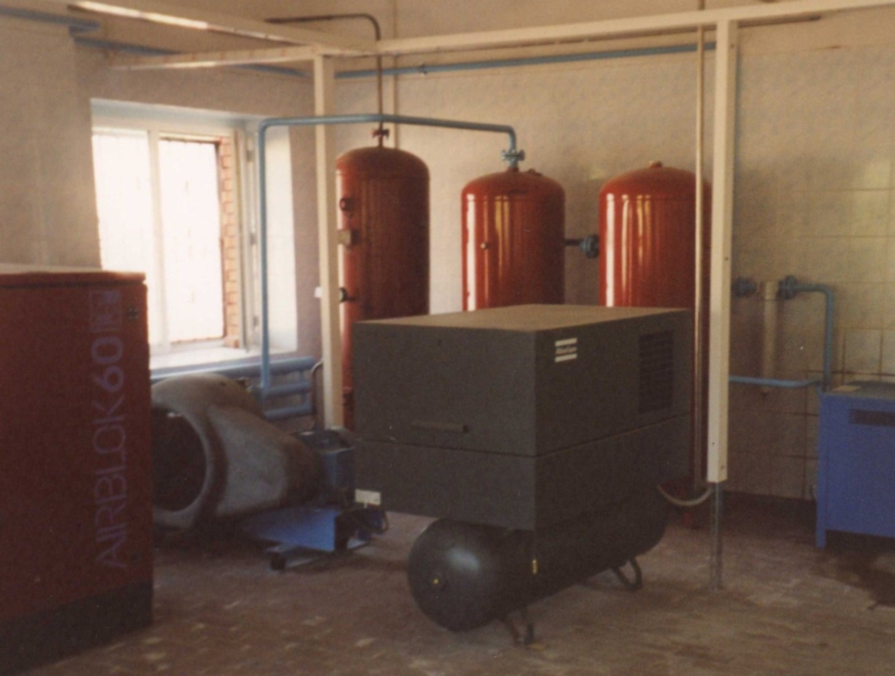 Компрессорная Энского молочного завода. Слева - воздушный винтовой компрессор. Сжатый воздух из него поступает в воздушные ресиверы (в центре и крайний справа). Из ресиверов сжатый воздух проходит через воздушный фильтр (вертикальный "цилиндр" на стене), рефрижераторный осушитель (справа на фото, синего цвета) и еще один фильтр. Далее сжатый воздух поступает в дожимающий компрессор (бустер), находящийся правее винтового компрессора, а из него в ресивер высокого давления (продукция "Курганхиммаш"). После ресивера высокого давления сжатый воздух еще раз проходит через систему фильтров и поступает на участок выдува ПЭТ-тары.